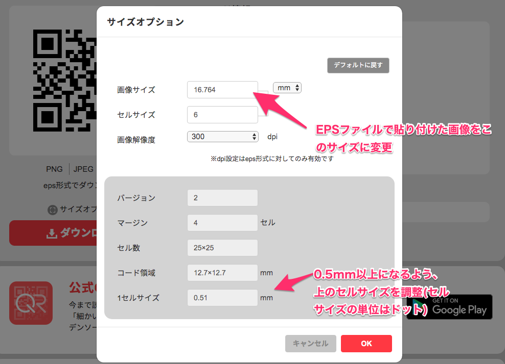 ちゃんと入力データの量によってバージョンを切り替えてくれるし(バージョン低=情報量少)、セルサイズや余白サイズなどすべて計算してPNG/EPS出力してくれる。