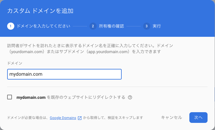 これで Firebase Hosting の設定は完了。mydomain.com でプロジェクトのページが開けるようになってるはず。